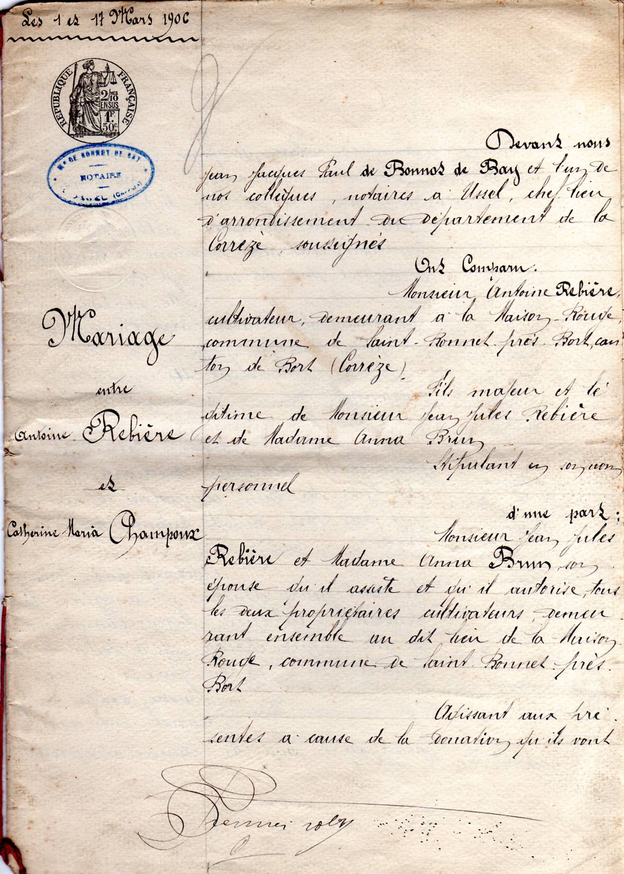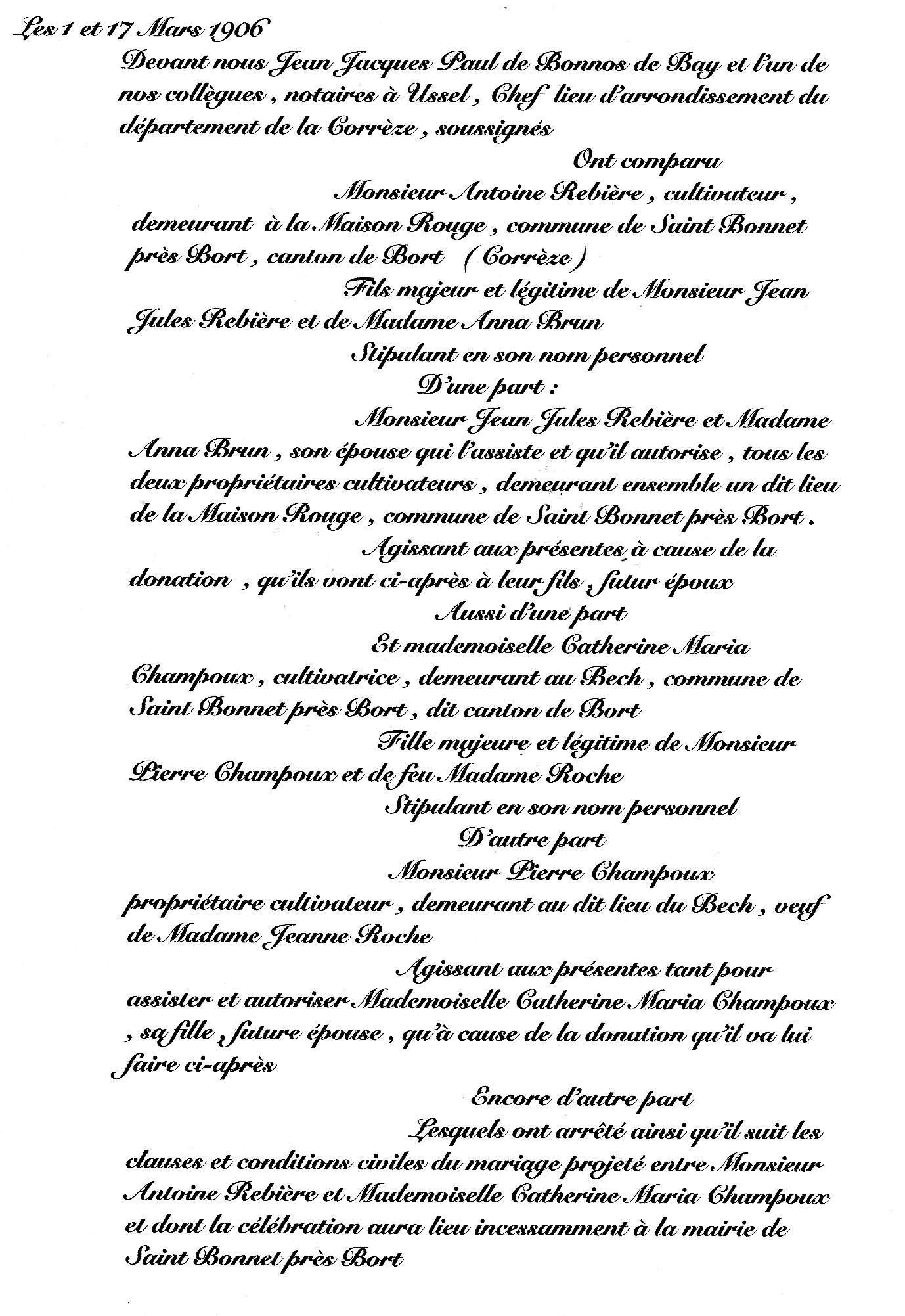 Ci-après extrait du contrat de mariage d’Antoine Rebière et de Maria Champoux