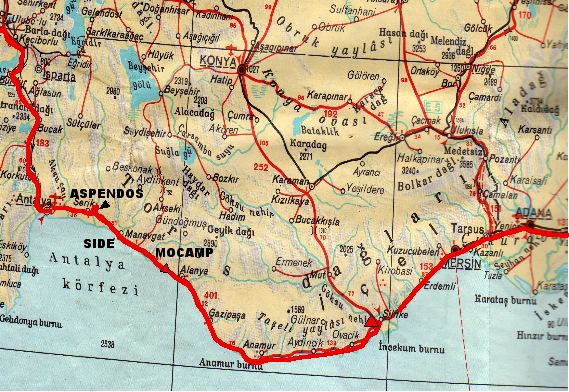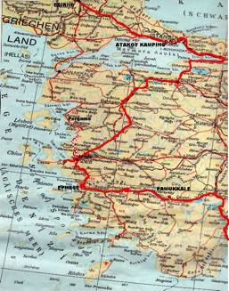 Nous traversons d’immense champs de blé , une tortue traverse la route , nous avons des aperçus sur la mer avec des motels , de belles villas de vacances turques .