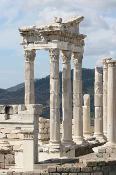 Le temple de Jupiter est construit sur un énorme soubassement qui le surélève de 7m50 au dessus des autres monuments . Il mesurait 87m de longueur sur 47 m , avec 54 colonnes (il ne reste que 6 d’entre elles de 20m de hauteur et 2m20 de diamètre , dominés par un entablement merveilleux que nous contemplons longuement . La frise de l’architrave est décorée de taureaux et de lions et la corniche décorée d’entrelacs , de perles , oves , grecques , acanthes , têtes de lions gueules béantes .