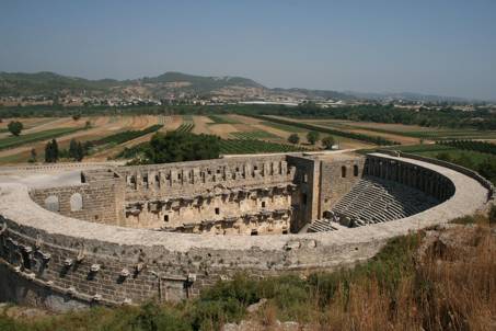 Sur l’acropole , on voit des colonnes du sanctuaire romain et le théâtre reconstitué , le sol de l’orchestre qui comportait une belle mosaïque représentant un Bacchus a été transporté au musée de Beyrouth .