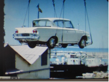 Il faut attendre l’ouverture de la douane pour pouvoir monter à bord , j’y monte vers 11heures , et m’installe dans la cabine , très joyeuse , je défais ma valise , bois un « normogastril » ( toujours ma phobie du mal de mer) , avec l’eau non potable du robinet …puis je monte sur le pont regarder l’embarquement de la voiture et de la caravane , c’est très lent …à se demander si ce n’est pas fait exprès …et pauvre Claude qui subit toute la chaleur de midi , à coté de sa voiture qu’il ne veut pas abandonner dans sa grande épreuve ! moi je suis bien , j’ai de l’air sur le pont . Un employé du C.N.T. ( conseil national du tourisme ) vient m’interviewer sur mes vacances au Liban …ça fait passer un moment . Je redescends à la cabine pour prendre la caméra pour filmer lz voiture au bout d’un fil …je me perds dans les couloirs …ça ne fait rien , ça occupe le temps ! je remonte sur le pont où j’assiste …enfin…au chargement de la voiture . Pour la caravane ils n’ont pas l’air