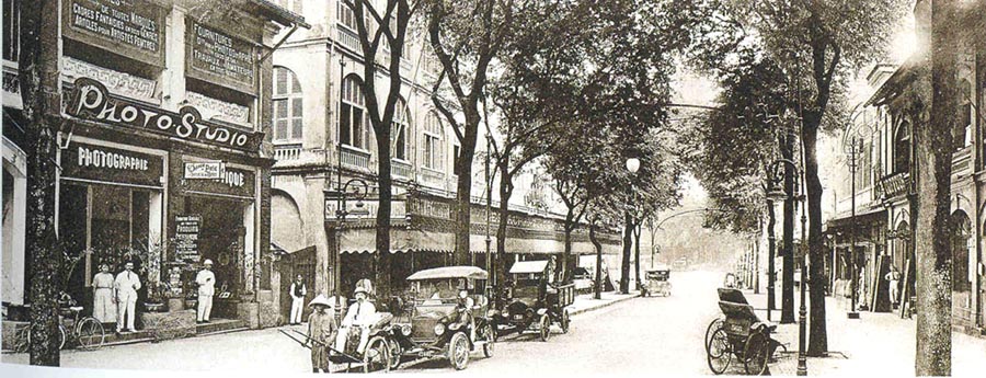 La rue Catinat où l’ on flâne est bordée de terrasses de café , de glaciers et de boutiques de luxe . il est photographié dans un pousse-pousse et envoie une carte postale du jardin d’ acclimatation .