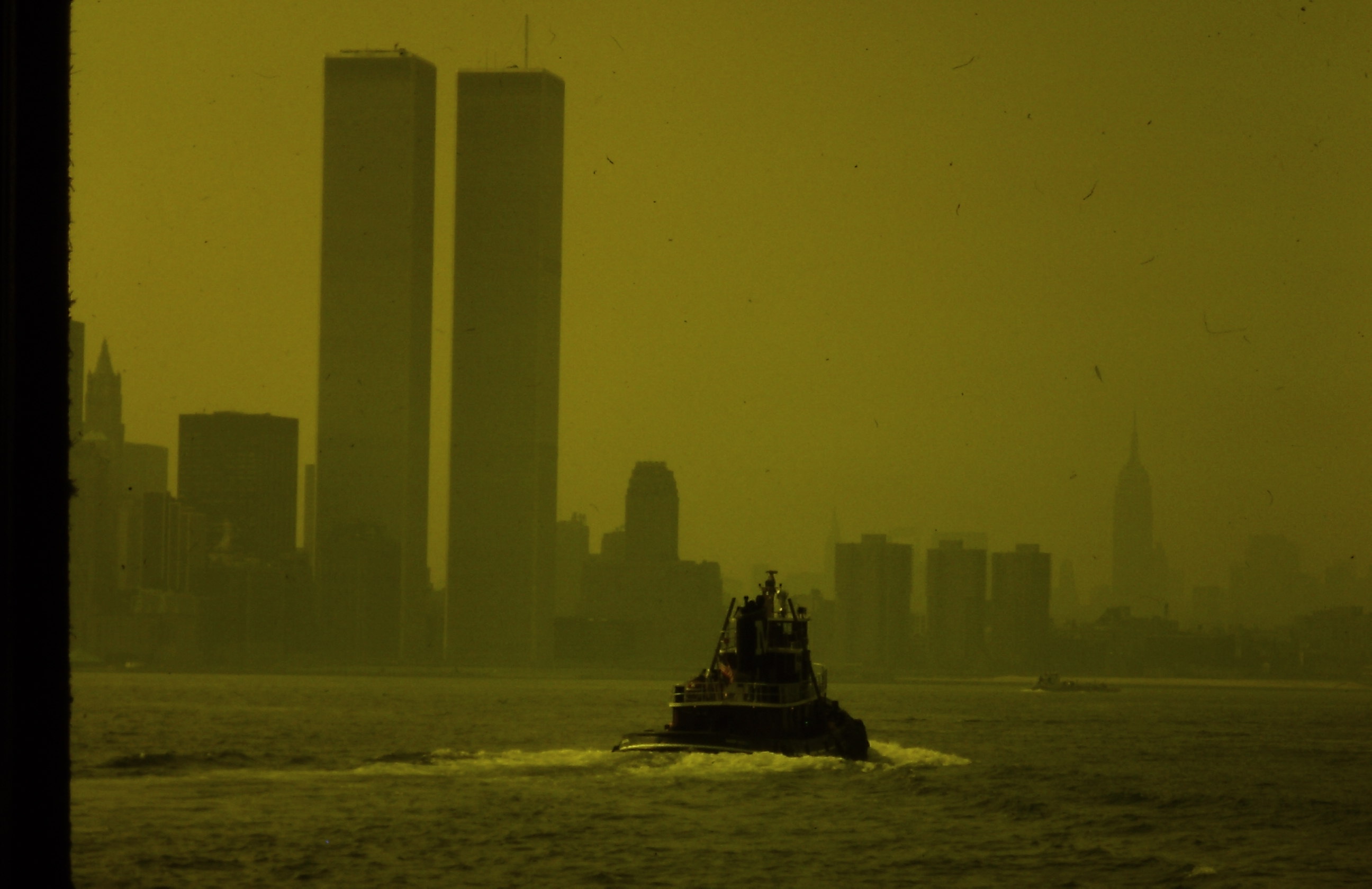 Depuis le bateau sur l’Hudson nous apercevons les Twins Towers qui viennent d’être construites (j’ai oublié mon filtre jaune sur l’objectif!).