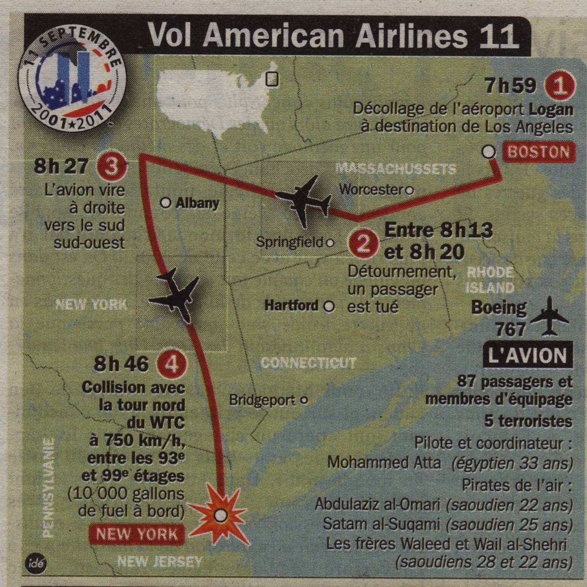 Le vol 11 American Airlines, un Boeing 767 transportant quatre-vingt-un passagers et onze membres d’équipage, décolla à 7 h 59 avec quatorze minutes de retard de l’aéroport international Logan de Boston dans le Massachusetts. Il avait pour destination Los Angeles, en Californie[24].