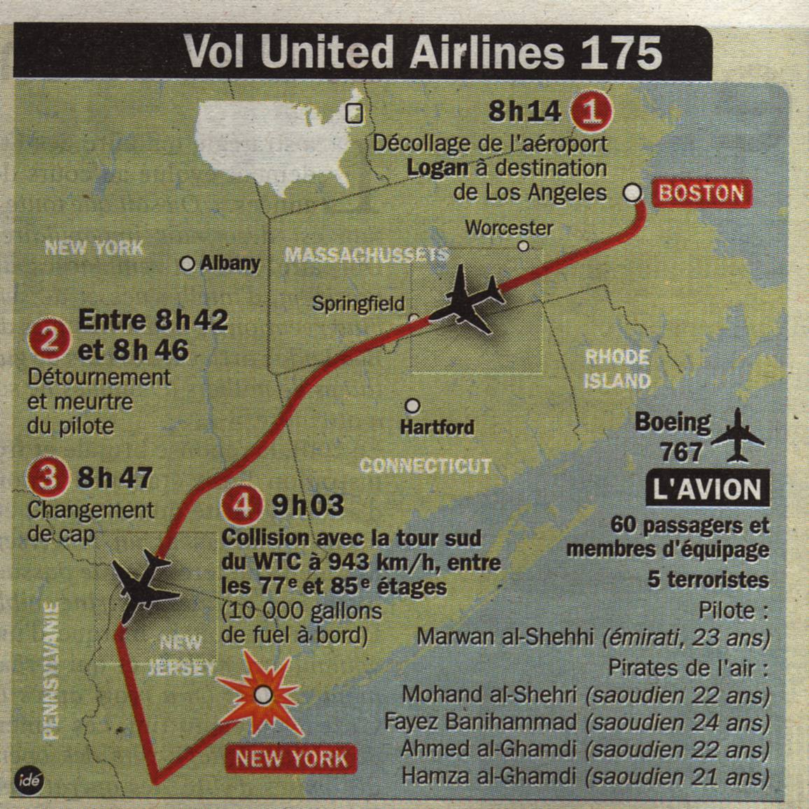 Le vol 175 United Airlines, un Boeing 767 transportant cinquante-six passagers et neuf membres d’équipage, quitta l’aéroport international Logan de Boston à 8 h 14 avec seize minutes de retard. Il devait également rejoindre Los Angeles[26].