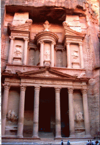 Après 20minutes de marche , la faille s’élargit pour laisser voir la façade du Temple Khazneh . C’est le plus beau monument de Pétra , haut de 40m et entièrement sculpté dans la roche .C’est le tombeau du Roi Nabatéen Arétas 3 (84 – 62 av J.C.) .