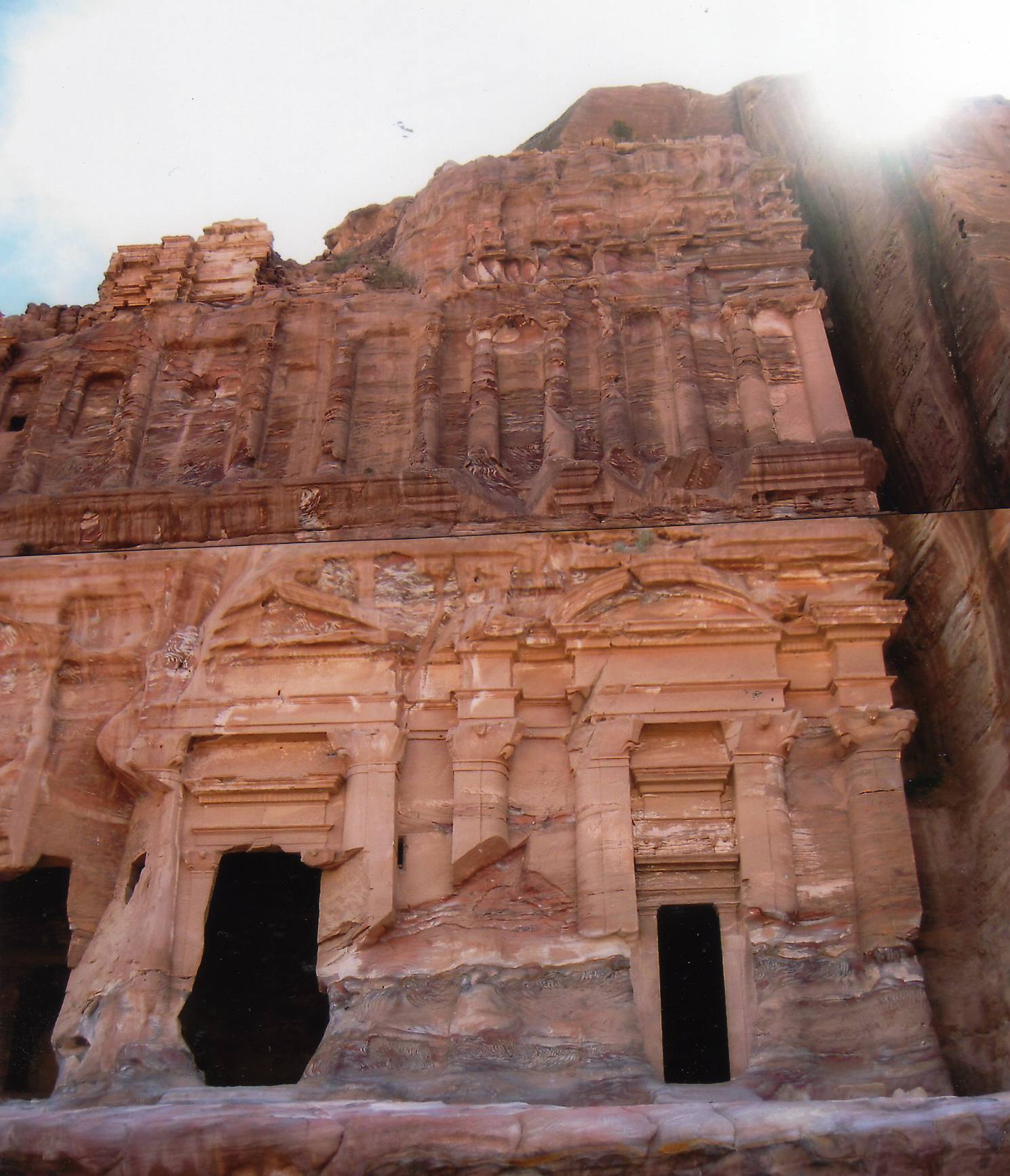 Cependant nous nous attardons devant les fastueuses façades des tombeaux à l’Urne , Moiré , Corinthien , et de celui à étages ( c’est la plus grande façade de Pétra : 46m de haut , 49 de large , avec 5 Niveaux ).