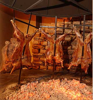la spécialité des restaurants est les viandes grillées sur des trépieds devant de grands feux de braise