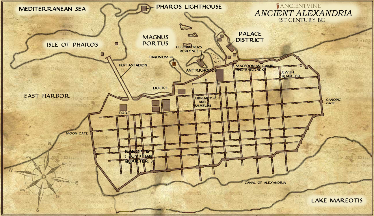Repartant dans sa conquête de l’Empire perse, Alexandre confie à Cléomène de Naucratis (une colonie grecque d’Égypte, dans le delta) et à Dinocrate de Rhodes la construction de la ville , conçue sur un plan orthogonal, ou en damier, avec de larges avenues se coupant à angles droits.