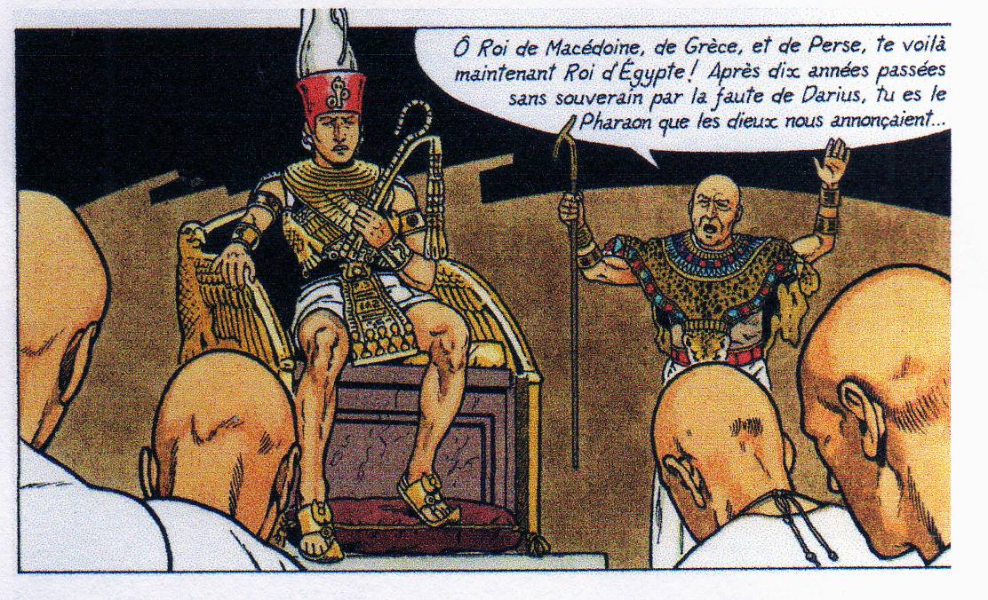 Alexandre se fait proclamer pharaon à Memphis en -331. Il sacrifie au taureau Apis — gage de respect des