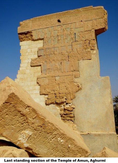 Avant de quitter Siwa , nous nous arrêtons devant le mur , seul vestige du temple dédiéà Amon qui date de la 30ème dynastie (règne de Nectanebo2) . Ce Temple endommagé par un tremblement de terre en 1877 , fut ensuite détruit par un officier Egyptien en 1897 pour en récupérer les matériaux .