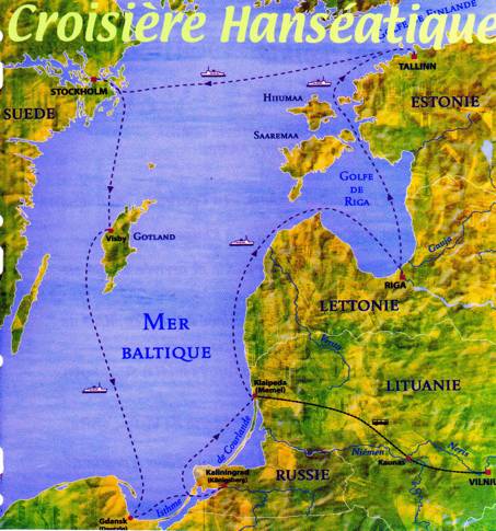 Partis de Gdansk (ex Danzig) en Pologne , nous devons successivement faire escale à Kaliningrad (ex Könisgsberg) en Russie , puis Klaipédia en Lituanie , puis à Riga en Lettonie et à Tallinn en Estonie , puis en traversant la Baltique , à Stockolm en Suède et enfin une dernière escale dans l’ Ile de Gotland avant de revenir à Gdansk .