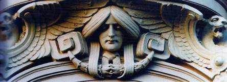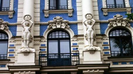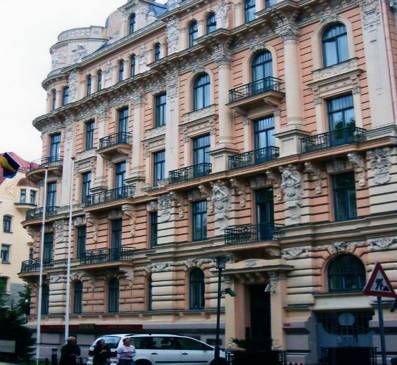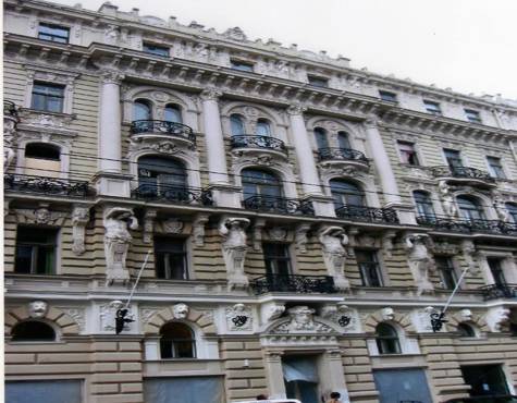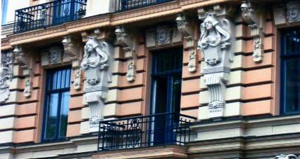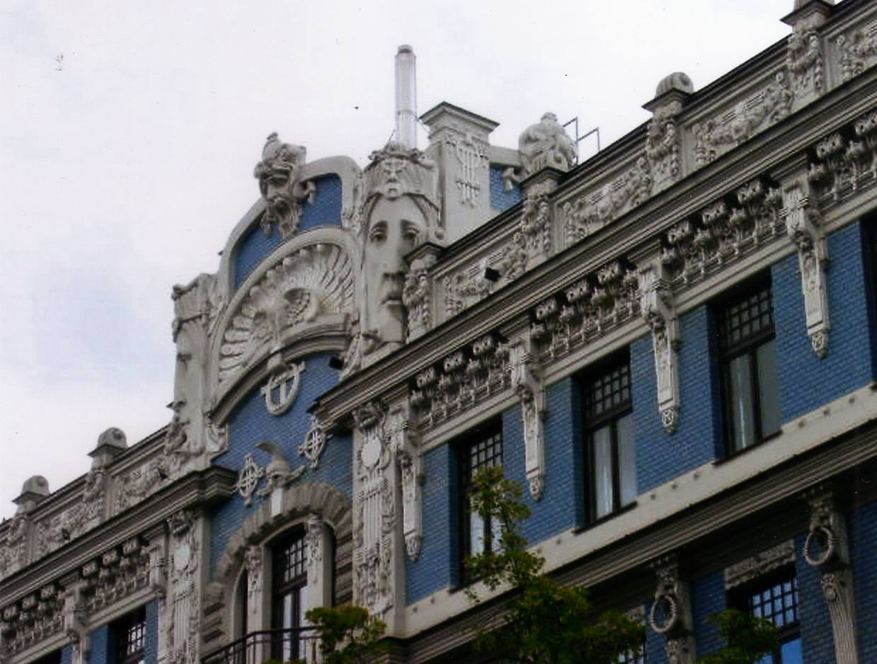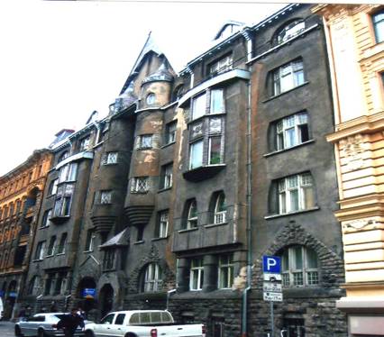Un peu plus loin dans la rue Alberta , un batiment conçu d’après des dessins de Mikhaïl Eisenstein en 1904 , se distingue par la richesse des sculptures décoratives .