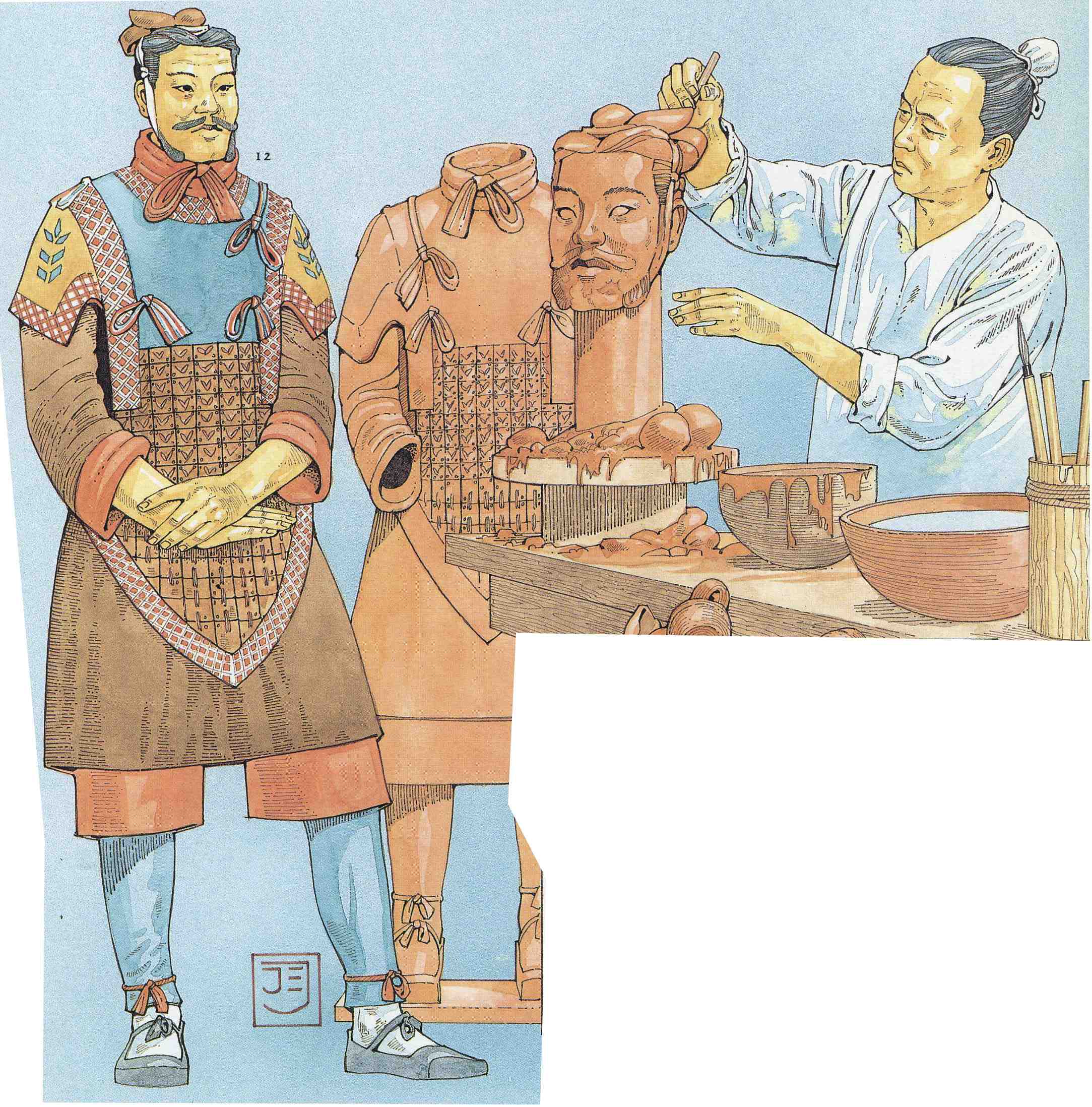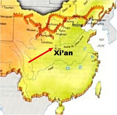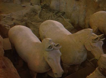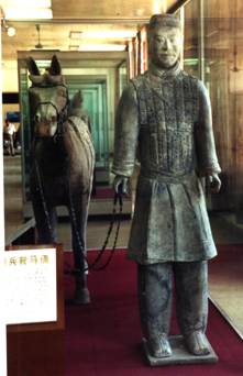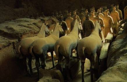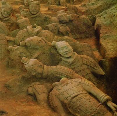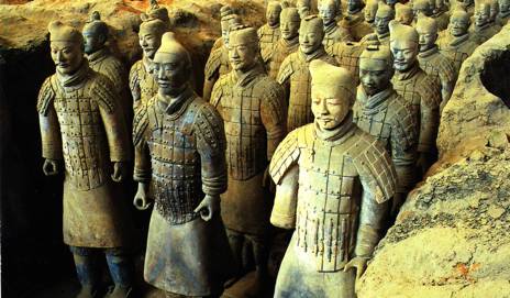 L’Empereur Qin Shihu Angi fit enterrer il y a plus de 2000 ans une copie de son armée dans les positions traditionnelles de combat : des milliers de statues de soldats de l’armée fabriquée en terre cuite. Les statues (environ 6000 guerriers : archers et arbalétriers, et des chars) sont remarquables, car chacune est unique, de taille légèrement supérieure à la taille réelle des soldats, et étaient à l’origine peintes. Malheureusement, la mise au jour fait perdre rapidement la couleur des peintures.