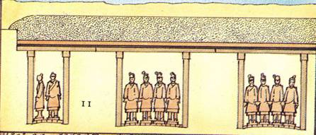 Chaque statue de terre cuite représente un soldat de l’armée (les corps étaient faits en série et les têtes réalisées individuellement ) chaque soldat tenait une arme réelle , ce qui provoqua le pillage ultérieur du site quelques années après sa réalisation . De plus un incendie fit écrouler le plafond en madriers de la tranchée .