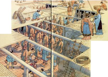 « Dès le début de son règne, Che-hoang (Qin Shi Huang) avait fait creuser et arranger la montagne Li. Puis, quand il eut réuni dans ses mains tout l’empire, les travailleurs qui y furent envoyés furent au nombre de plus de sept cent mille ; on creusa le sol jusqu’à l’eau; on y coula du bronze et on y amena le sarcophage; des palais, des (bâtiments pour) toutes les administrations, des ustensiles merveilleux, des joyaux et des objets d’art y furent transportés et enfouis et remplirent (la sépulture). Des artisans reçurent l’ordre de fabriquer des arbalètes et des flèches automatiques; si quelqu’un avait voulu faire un trou et s’introduire (dans la tombe), elles lui auraient soudain tiré dessus. On fit avec du mercure les cent cours d’eau, le Kiang, le Ho et la vaste mer  ; des machines le faisaient couler et se le transmettaient de l’une à l’autre. En haut étaient tous les signes du ciel, en bas toute la disposition géographique. On fabriqua avec de la graisse de phoque des torches qu’on avait calculées ne pouvoir s’éteindre de longtemps. Eul-che (Qin Er Shi) dit: « Il ne faut pas que celles des femmes de l’empereur décédé qui n’ont pas eu de fils soient mises en liberté. » Il ordonna que toutes le suivissent dans la mort; ceux qui furent mis à mort furent très nombreux. Quand le cercueil eut été descendu, quelqu’un dit que les ouvriers et les artisans qui avaient fabriqué les machines et caché les trésors savaient tout ce qui en était, et que la grande valeur de ce qui était enfoui serait donc divulguée ; quand les funérailles furent terminées et qu’on eut dissimulé et bouché la voie centrale qui menait à la sépulture, on fit tomber la porte à l’entrée extérieure de cette voie, et on enferma tous ceux qui avaient été employés comme ouvriers ou artisans à cacher (les trésors) ; ils ne purent pas ressortir. On planta des herbes et des plantes pour que (la tombe) eût l’aspect d’une montagne.