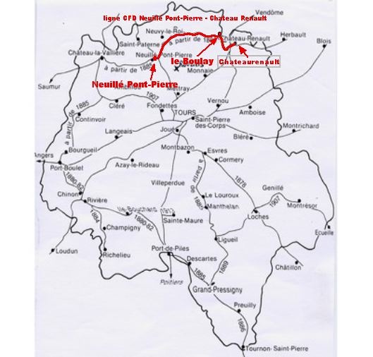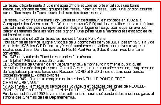 ce réseau nord comportait les lignes de Port Boulet à Chateau-Renault 104kms, avec embranchement de Rillé-Hommes à Fondetes 26kms.