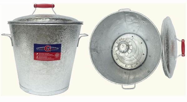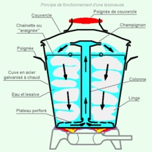 La lessiveuse est un récipient en fer galvanisé d’ une contenance de 50 l d’eau qui comporte un double fond amovible sur lequel est fixé un tube avec en haut un pommeau qui arrose le linge d’eau bouillante (voir les dessins et photos).