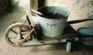Ensuite le linge est retiré de la lessiveuse et mis dans une grande bassine placée sur la brouette .