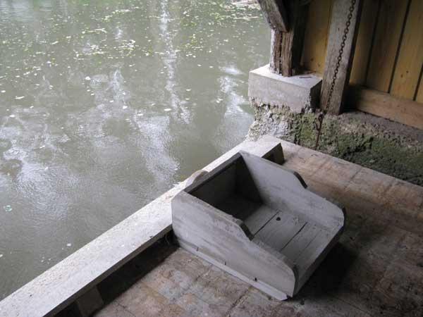 Dans le lavoir , les laveuses étaient à genoux dans des boites en bois .