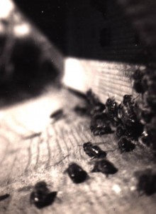 Grace à une loupe placée devant l’objectif d’un appareil photo je pus photographier les abeilles sur la planchette à l’entrée de la ruche .