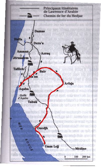 La tâche exacte de Lawrence est assez trouble : espion, diplomate, instructeur, conseiller ? Toujours est il qu’il rassemble une petite troupe de bédouins, et dirige avec l’Emir les attaques à la dynamite contre le chemin de fer du Hedjaz et rêve de prendre aux turcs le port d’Aqaba .