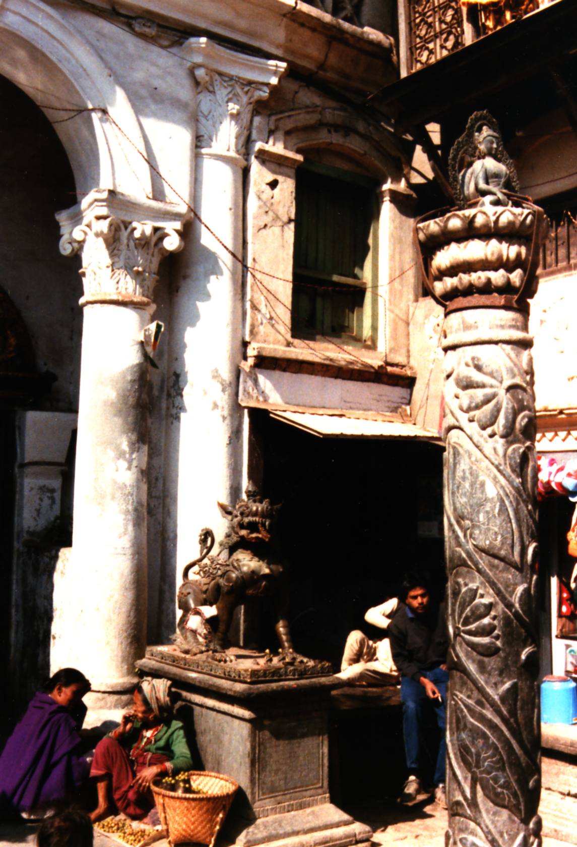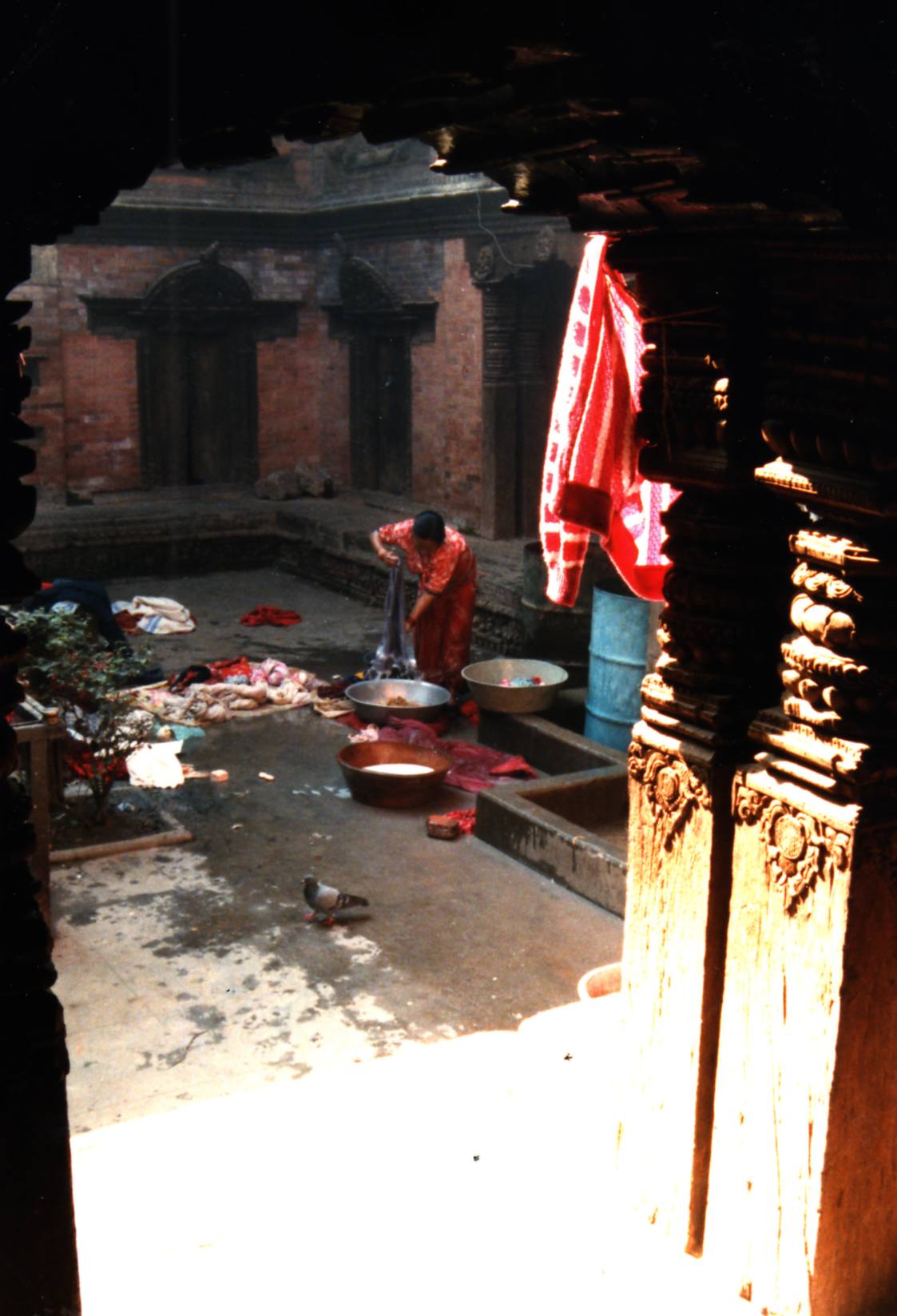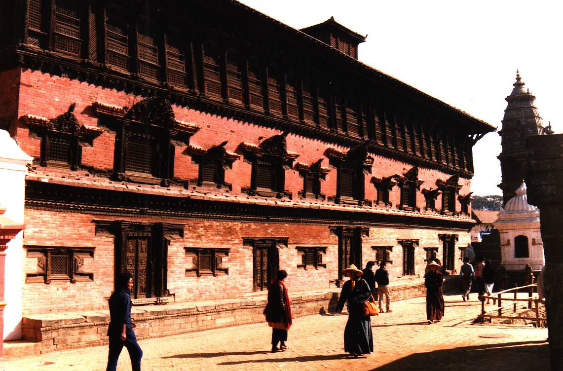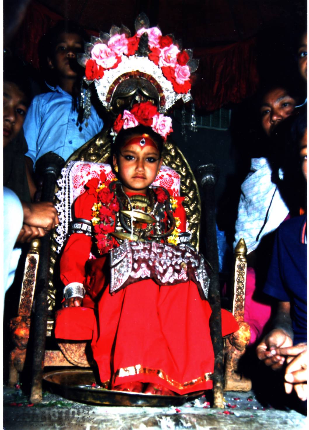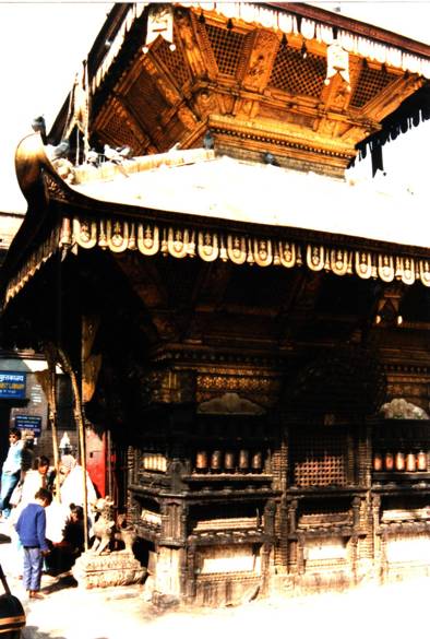 Nous entrons ensuite dans la maison de la « Kumari » ou Déesse vivante : Elle est choisie dans la caste Newar après avoir subi les épreuves dont la plus redoutable est de faire le tour de la cour du temple royal de Taleju , la nuit , alors que des têtes de buffles fraîchement égorgés sont disposées sur des poteaux avec chacune une bougie posée sur le crâne de chaque animal , elle doit effectuer ce parcours sans montrer la moindre crainte .