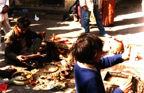 Et dans la rue un Gubaju (Prêtre Newar ) officie , disposant devant la divinité des offrandes de riz , de fleurs , de noix , tout en psalmodiant des hymnes bouddhistes .