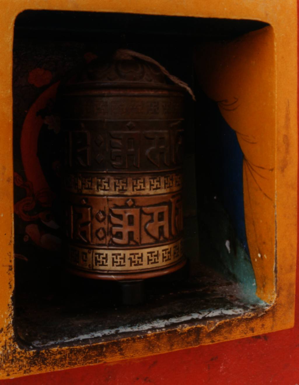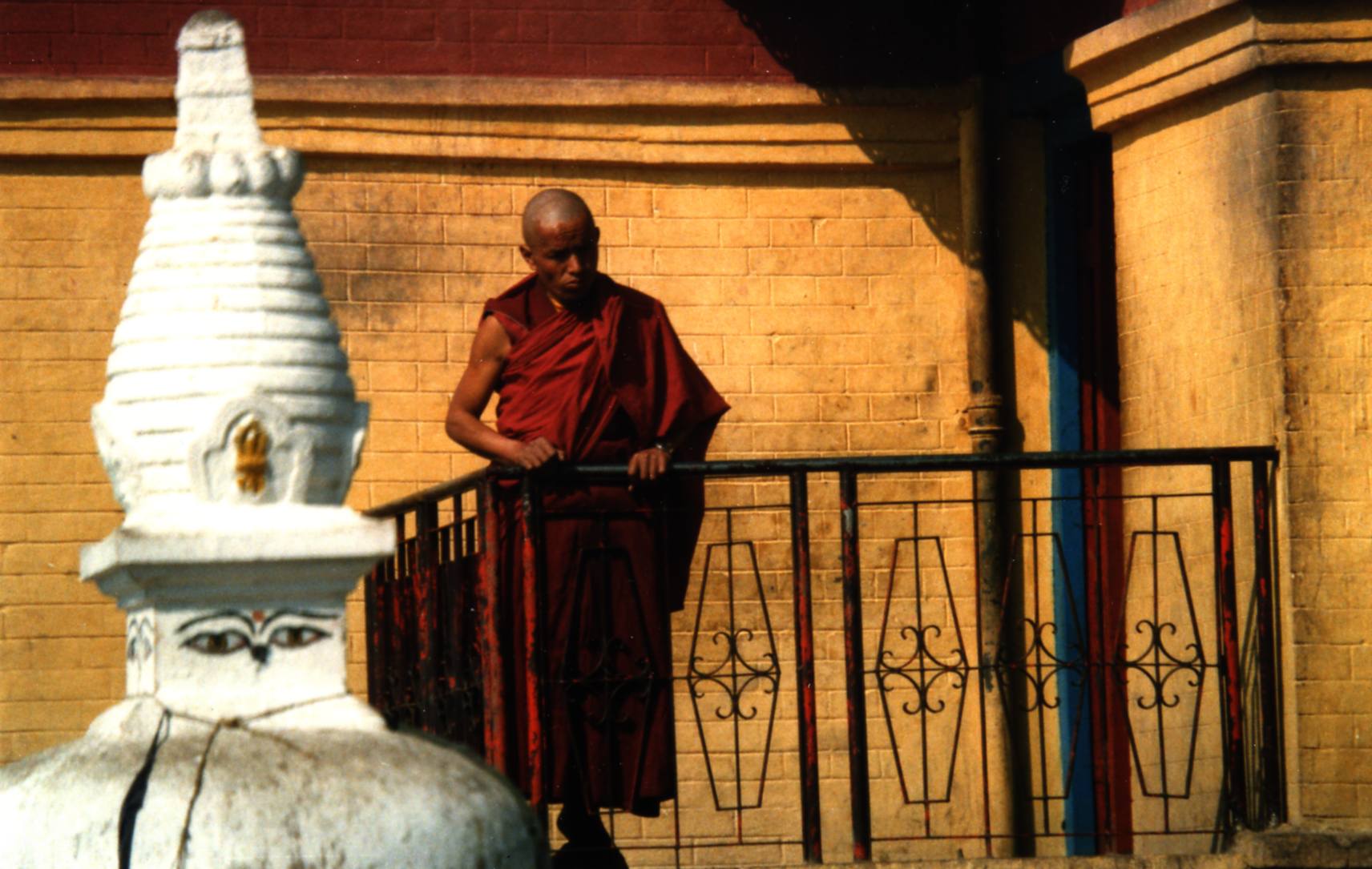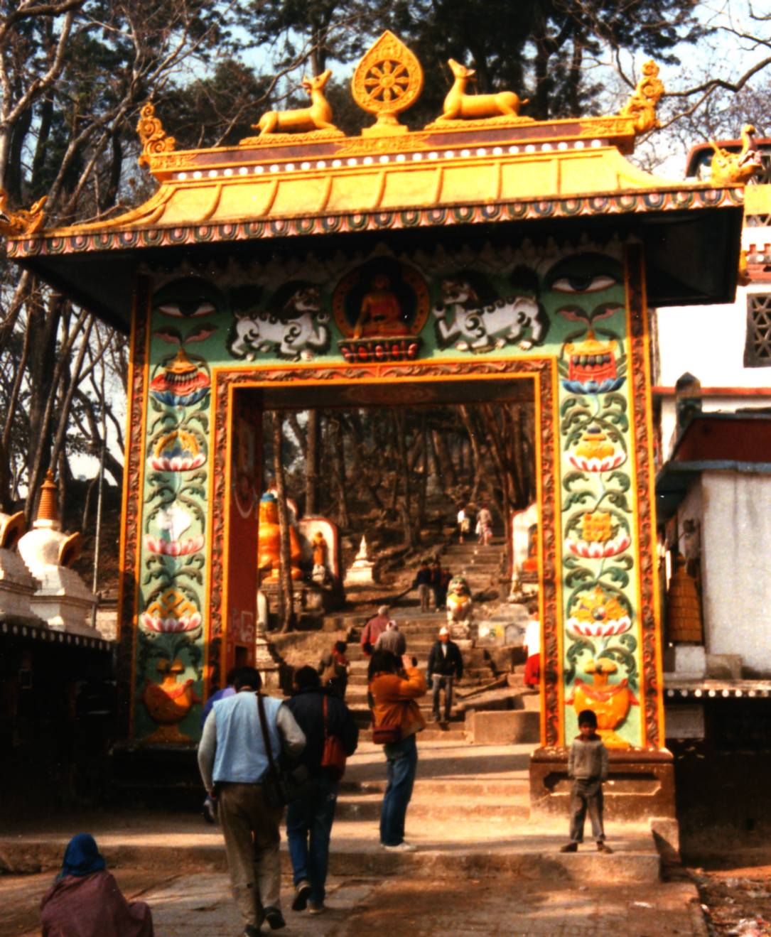 Chaque matin les pélerins , après avoir fait tourné le moulin à prière , placé dans le pilier de l’entrée , s’engagent dans l’escalier de 300 marches qui se font de plus en plus hautes à mesure que l’on approche du sommet .