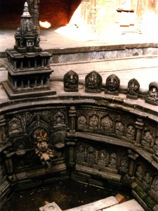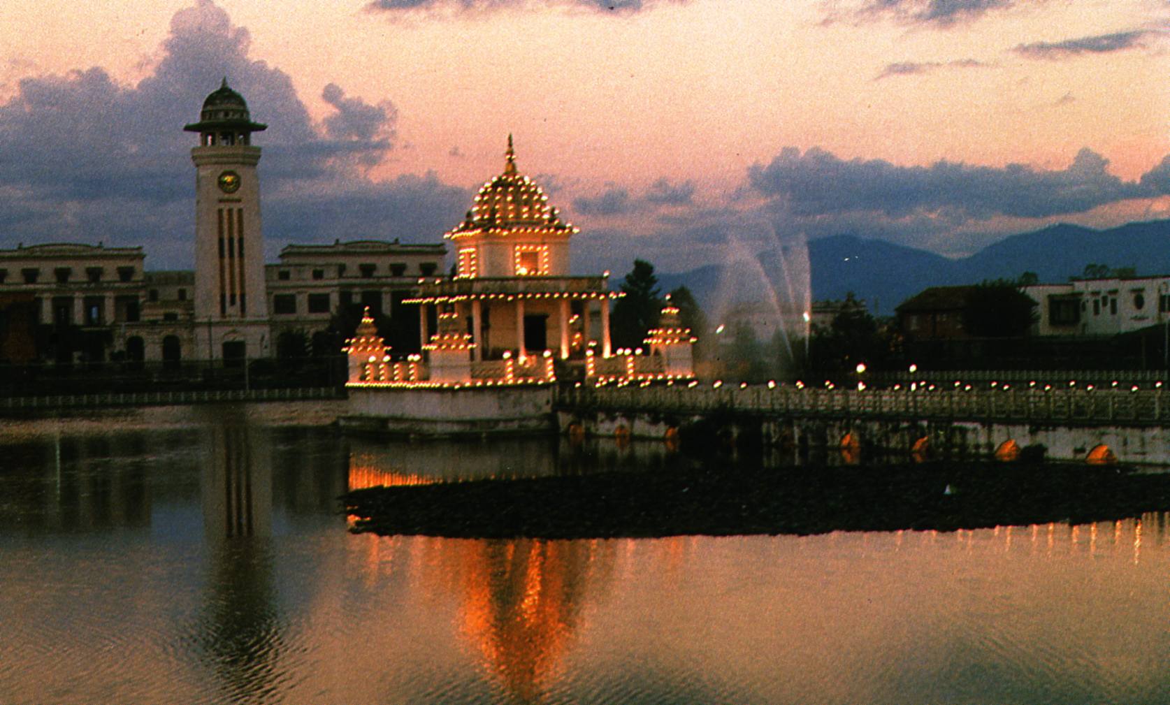 En revenant vers l’Hotel à la nuit tombante , on passe devant le bassin du Rani Pokhari au milieu duquel , au 16ème siècle , la femme de Patrap Malla fit construire un temple à la mémoire de son fils