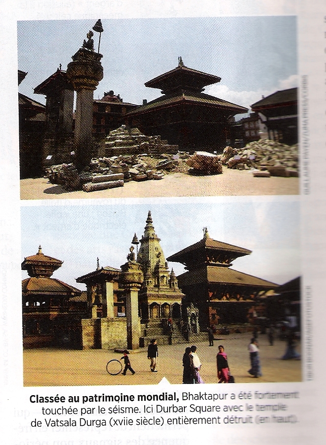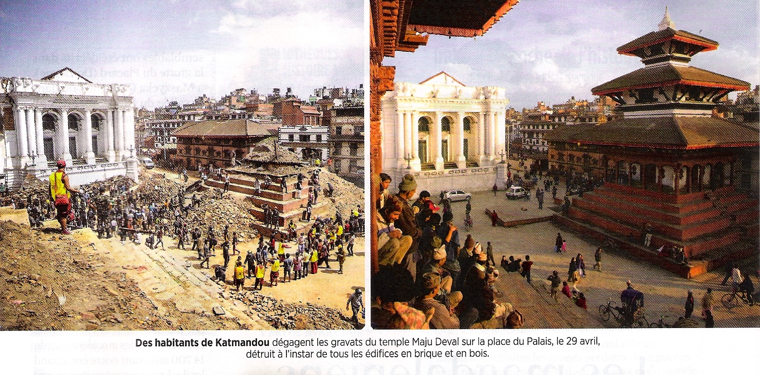 24 avril et 12 mai 2015 , l’horreur , après l’annonce des violents tremblements de terre qui ont secoué le Népal , les premières photos des dégâts nous parviennent , les pertes en vies humaines sont énormes : 8000 morts et 18000 blessés … mais à cette horreur s’ajoute la perte pour le patrimoine humain de joyaux de l’architecture : je cite l’Article de Science et Avenir : Des têtes de Shiva émergeant des gravats , des statues de Bouddha extraites des décombres …le violent séisme de magnitude 7,8 qui a frappé le Népal le 25 Avril 2015 se révèle aussi une catastrophe pour pour le patrimoine de ce petit pays .