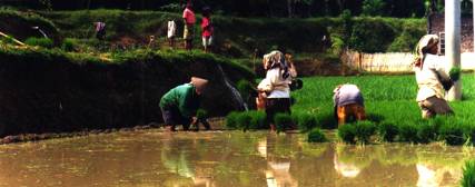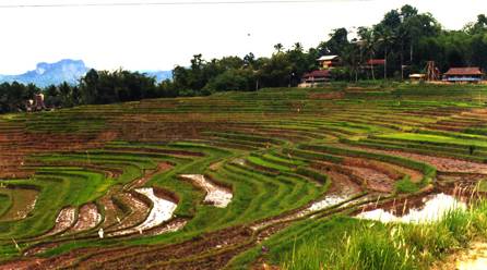 En nous éloignant de la mer nous traversons des paysages de rizières en terrasses , avec le repiquage du riz .