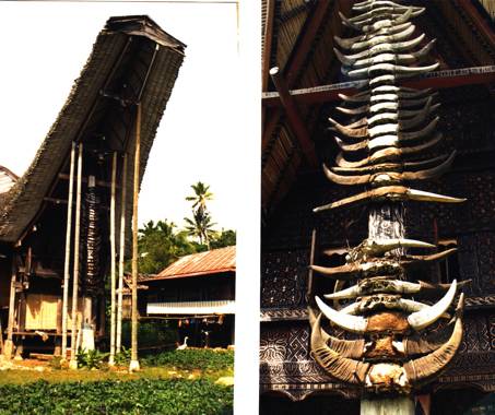 Les toitures en sont recouvertes de motifs géométriques , elles sont également ornées de cornes de buffle dont le nombre et la taille dépendent du rang social de la famille .