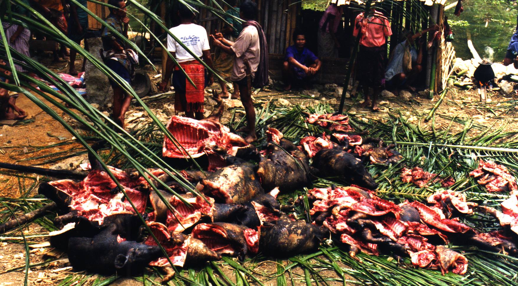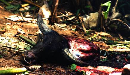 Le prêtre fixe le moment ou d’un coup de machette on coupe la gorge du premier buffle blanc qui servira de monture à l’âme du défunt , les autres buffles (jusqu’à 12 , suivant le rang social du défunt ) sont sacrifiés à leur tour ….et le dépeçage rituel commence .