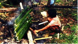 une spécialité étonnante : le sang de porc cuit dans des bambous …une sorte de boudin :