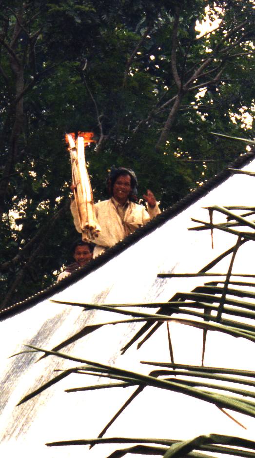 Le prêtre promène une torche dans toute la maison …et même sur le toit !!