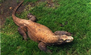 De couleur marron brique , virant au rouge chez les mâles adultes , la peau incrustée de plaques osseuses , des pattes armées de griffes puissantes , se nourrissant de chairs , capable de traîner un cerf adulte en terrain accidenté , courant vite avec des pointes à 30 km , le Varan de Komodo n’est dangereux que si on le provoque !!