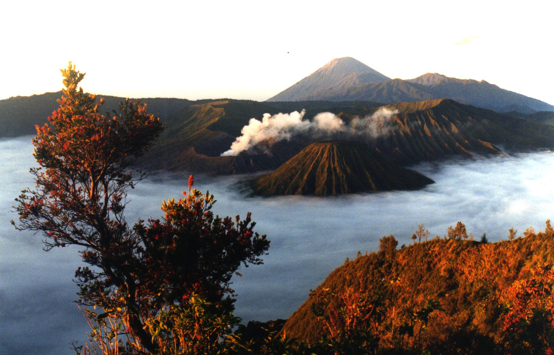 Le point de vue est fabuleux avec les trois volcans : Bromo , Batok et Semeru .