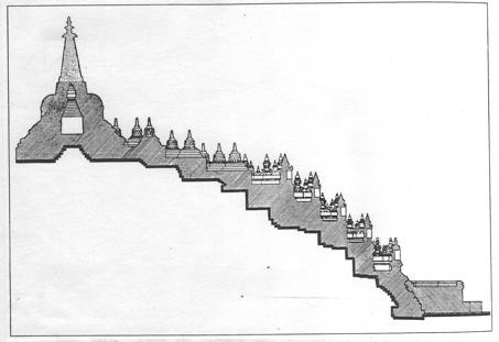 Au sommet trône un immense stupa de 15 mètres de diamètre , vide , symbolisant l’absolu : le nirvana !!