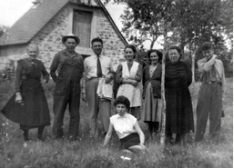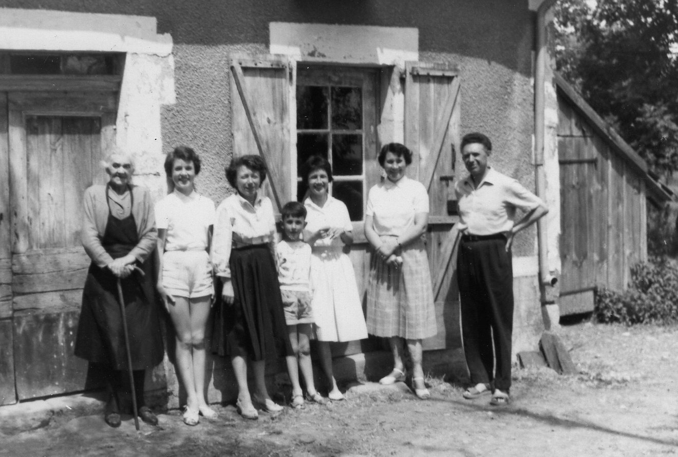 Sur la photoci-contre on voit de gauche à droite : Maria Champoux-Rebière , Gaston Rebière , Pierre Rebière , Gilberte Chardon , Thérèse Chardon femme de Gaston , Marie-Louise Breuil-rebière , Marc Rebière , et sur la deuxième photo ci-dessous , datant de 1959 on voit , devant la maison , de gauche à droite :Maria Champoux , Françoise Josset , Marie-Louise Breuil-Rebière , Alain Josset , Colette Josset , Fernande Josset-Brossier et Pierre Rebière. On aperçoit les deux portes d’entrée de la maison et leurs volets et le hangar attenant .