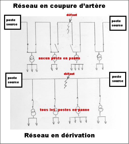 avec le réseau de cables 3X240 mm2 Alu en coupure d’artère on peut isoler rapidement le câble en défaut ou le poste en panne et alimenter les autres postes , au contraire , sur le réseau en dérivation , tout le réseau est en panne jusqu’à la réparation !!!