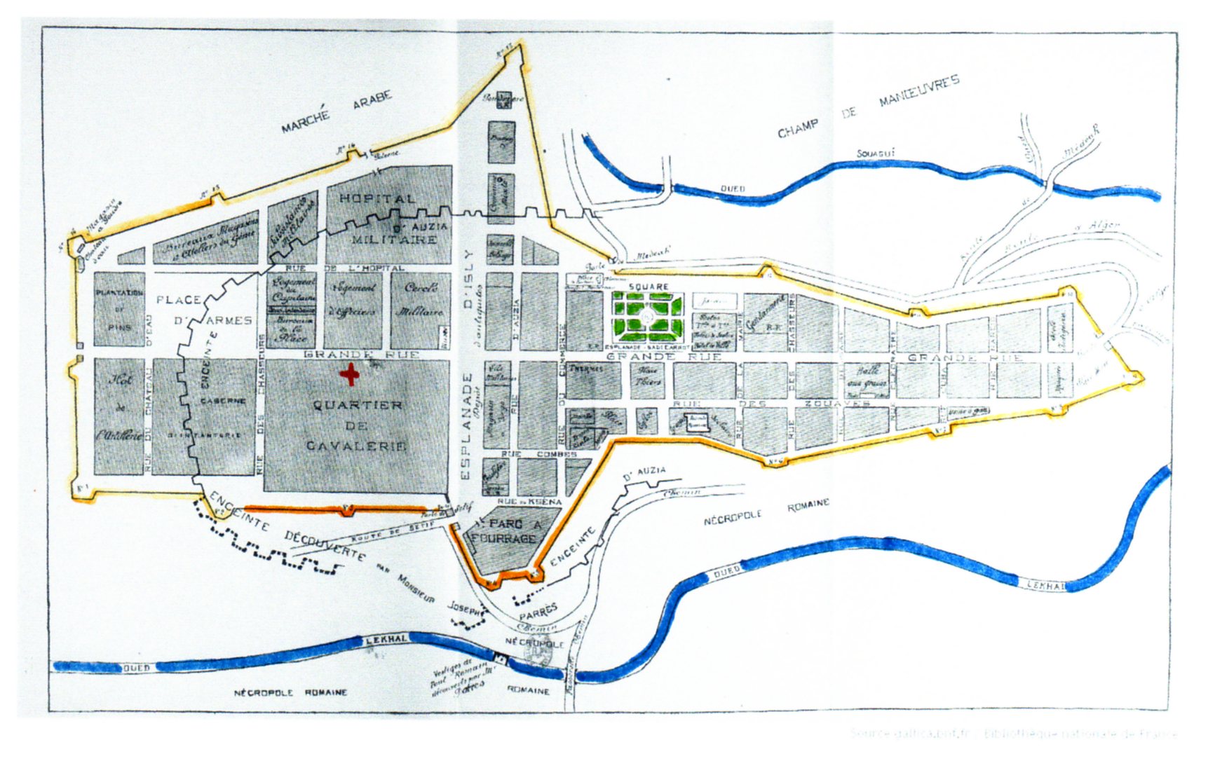 La garnison est importante surtout dans cette période de « pacification » et occupe une partie importante de la ville : Deux immenses casernes, le quartier Lanusse pour l’infanterie, le quartier Mireur, pour la cavalerie, construites sur rez-de-chaussée, élevées de deux étages et combles et pouvant contenir 2.000 hommes.