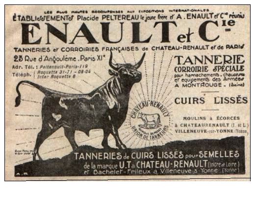 En 1914, beaucoup de petits établissements ont disparu en Touraine et seul Château- Renault conserve et accroît son importance. A cette date, 20 tanneries existent encore en Indre-et-Loire, dont 9 se situent à Château-Renault. La production est toujours centrée sur le