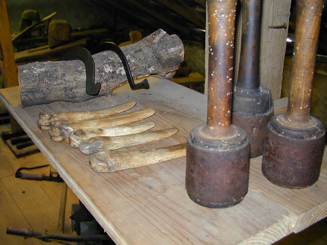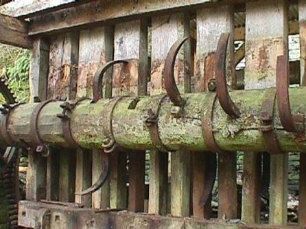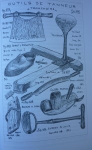 ames planes (ici en os), ils servaient à décoller les écorces de chêne destinée aux tanneries. Ensuite des moulins à pilons permettaient de broyer les écorces . Les moulins sont dotés d’une roue hydraulique dont l’axe est garni de cames qui soulèvent les « mentonnets des pilons Le bas de chaque pilon est revêtu d’une boite de cuivre du poids de 20 kilogrammes Les pilons sont dotés de deux types de couteaux l’un en forme de T l’autre en taillant simple .