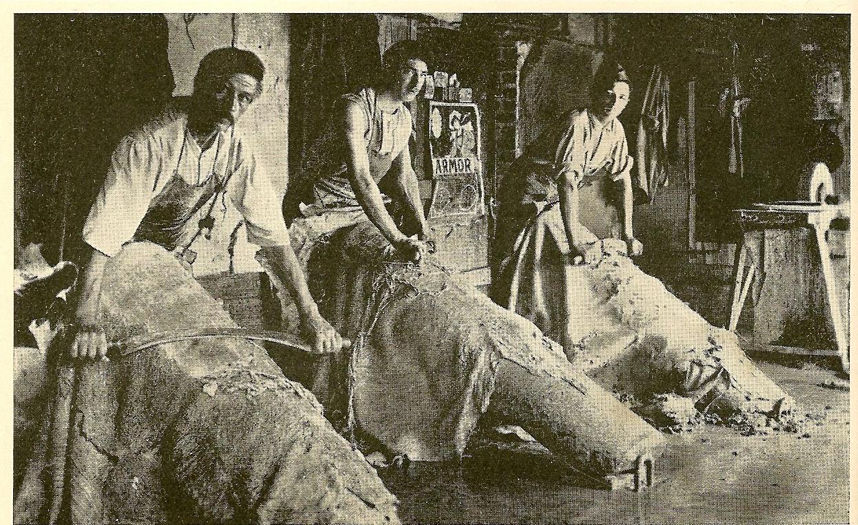 – L’ÉCHARNAGE a pour but de débarrasser la peau de tous les muscles, tendons, graisses pouvant encore adhérer à la peau avec un grand couteau à deux manches et lame