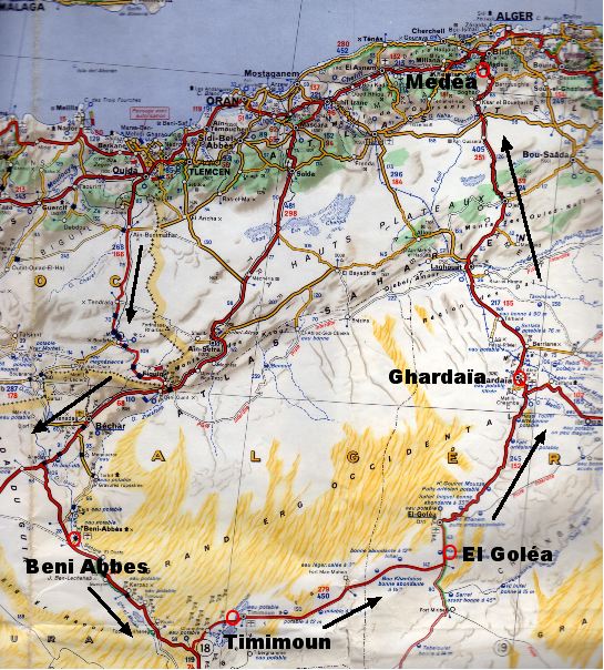 Cela nous fait un drôle d’effet lorsque nous quittons la route du sud vers Adrar et Réggane pour repartir vers l’est : Timimoun …El Goléa … : notre réservoir d’essence est plein ainsi que le jerrican , en ce qui concerne l’eau nous n’avons que 20 litres !!!