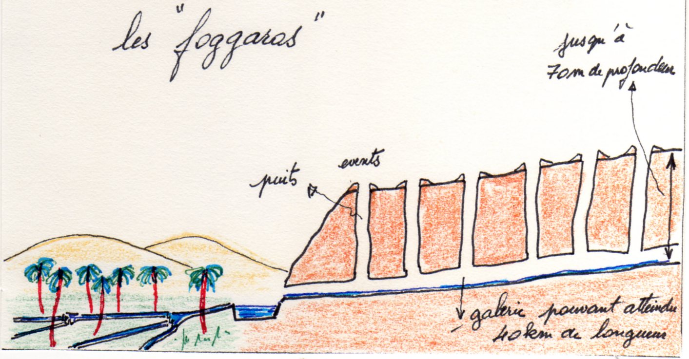 La foggara est une galerie souterraine légèrement inclinée, qui draine l’eau de l’aquifère en amont vers les terrains les plus secs situés en aval, en direction de la palmeraie. Ce procédé utilise un système de galeries en pente douce d’une longueur pouvant atteindre les 20 km, équipées d’une série de puits d’aération espacés de 5 à 22 m, dont la profondeur peut atteindre 20 m .