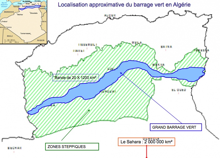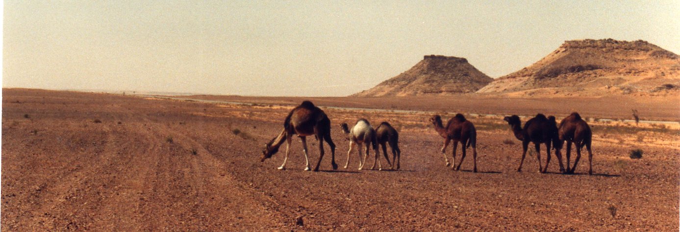 Nous apercevons les tentes noires des nomades dans les steppes désertiques , mais les paysages sont désolés sauf quand nous traversons le « grand barrage vert » destiné à stopper la progression du désert.