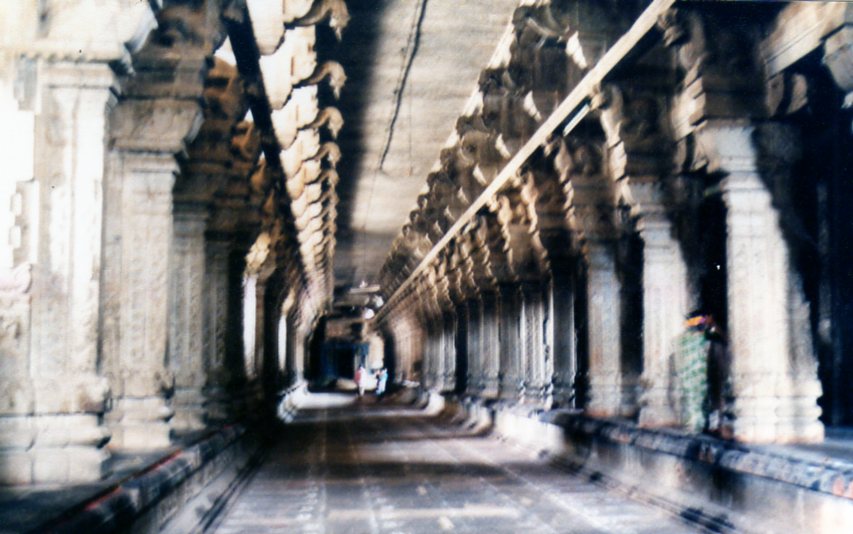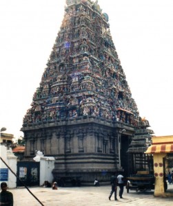 Le premier gopuram frappe par son immensité. Il est peu décoré. En fait, on est encore dans la rue et des échoppes de commerçants s’alignent sur les côtés. Il règne une agitation de bazar. On entre enfin dans le temple, après avoir laissé, comme à l’accoutumée, les chaussures à la porte.