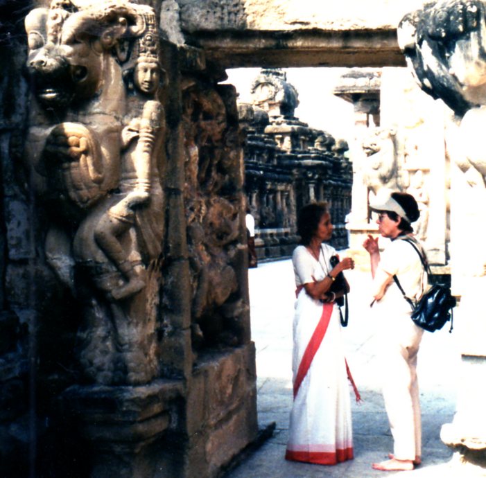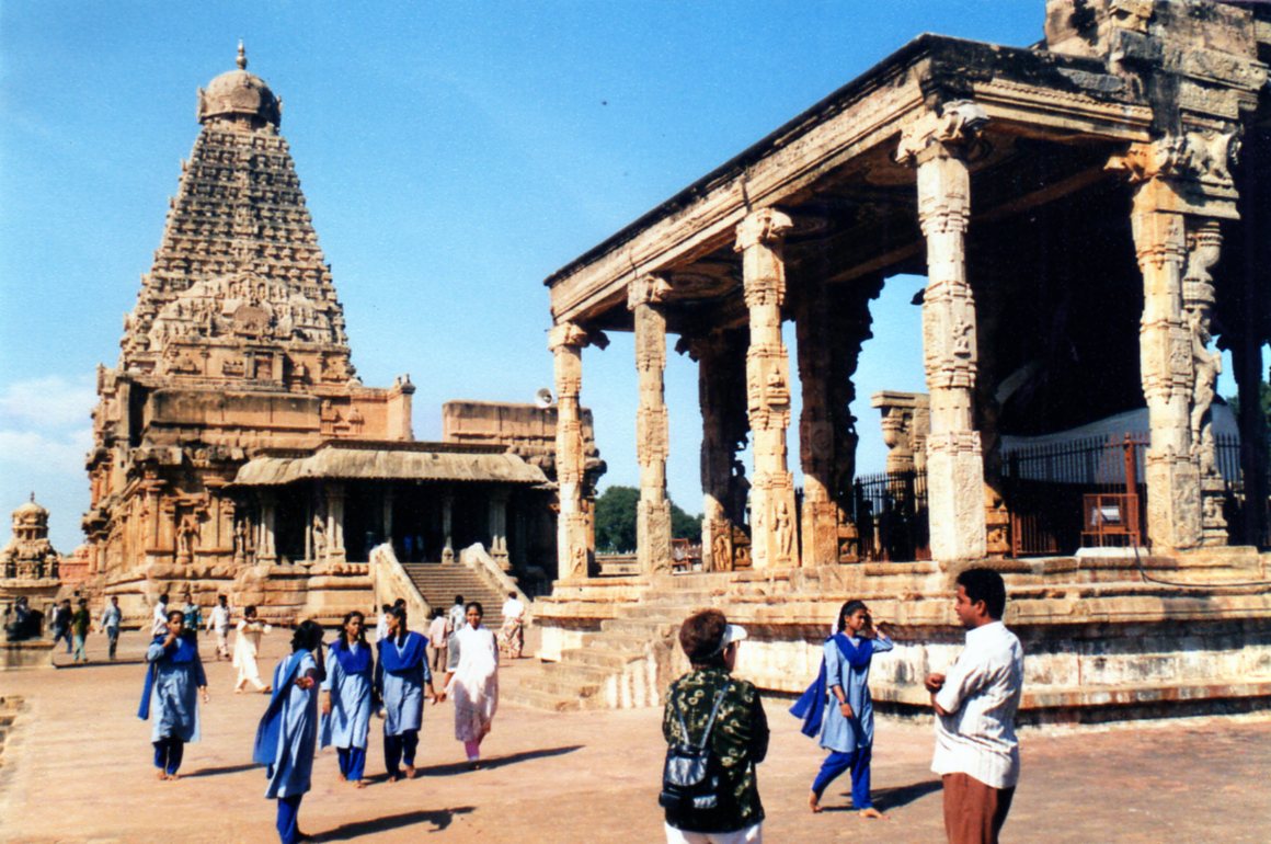 Construit en belles pierres blondes par le roi Chola Râjarâja entre 1003 et 1010. Le 257e jour de la 25e année de son règne (1010), Râjarâja assista à l’installation du pot de cuivre (kalash) au sommet du vimana de 13 étages et 66 m de haut, couronné d’un bloc monolithique de 81 tonnes. Cette cérémonie indiquait l’achèvement de la construction du temple et sa consécration. Le temple illustrait la puissance de la dynastie Chola.